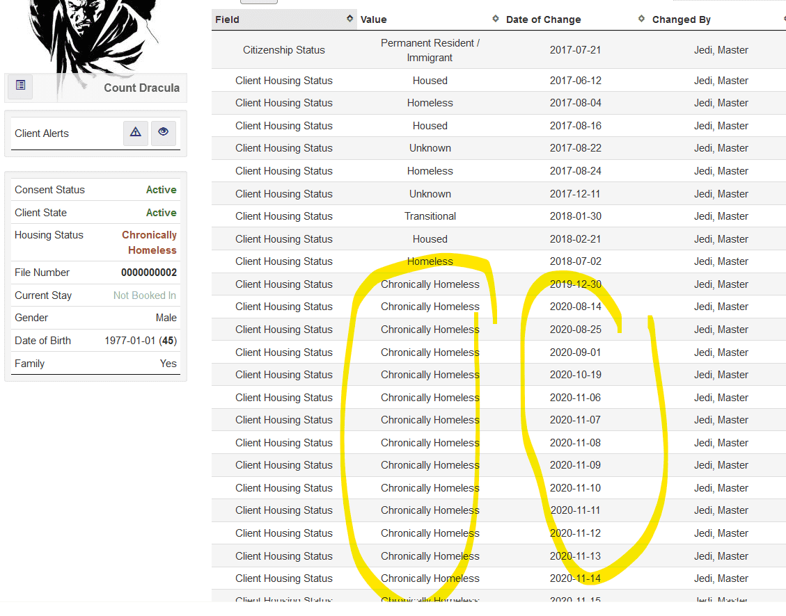 @isDailyis set to 1, this code should delete all housing status records from theHIFIS_ClientHistoryChangestable for the client that were created 'today'.However, since the duplicate 'Unknown' housing status records are all using the client's created date for their DateofChange, they are not deleted.