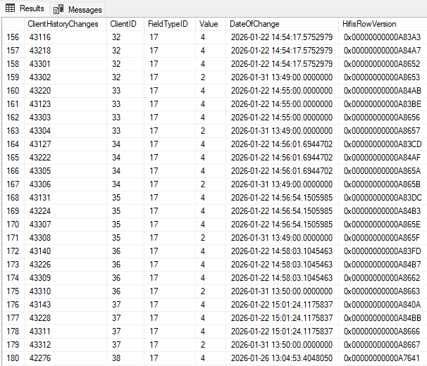 On January 22 I created a large family (clients 30 through 38) and when I look at the HIFIS_ClientHistoryChanges table I can see that each of these clients has 3 duplicate records indicating they are Unknown on Jan 22.