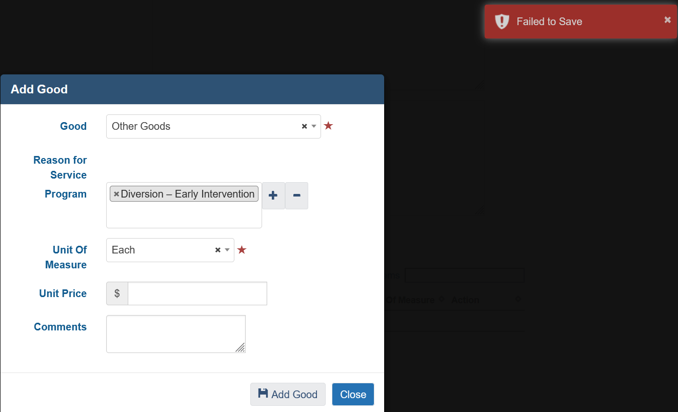 I created a Diversion record using one of our custom Reason for Service values. When I attempted to add a Good or Service through the Diversion record, an incorrect Reason for Service value populated, or no value populated and the field remained blank. I was also unable to complete adding the Good/Service record and received a Failed to Save error message.