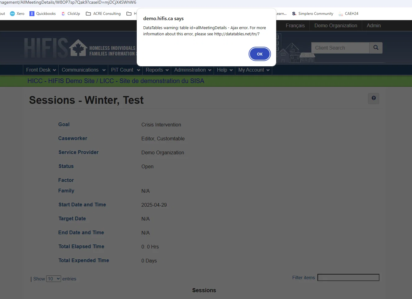 /HIFIS.Web/Views/CaseManagement/AllMeetingDetails.cshtmlon line 139, change"ajax": "@SessionUrl"to"ajax": { "url" : "@SessionUrl" , "type" : "POST"}In